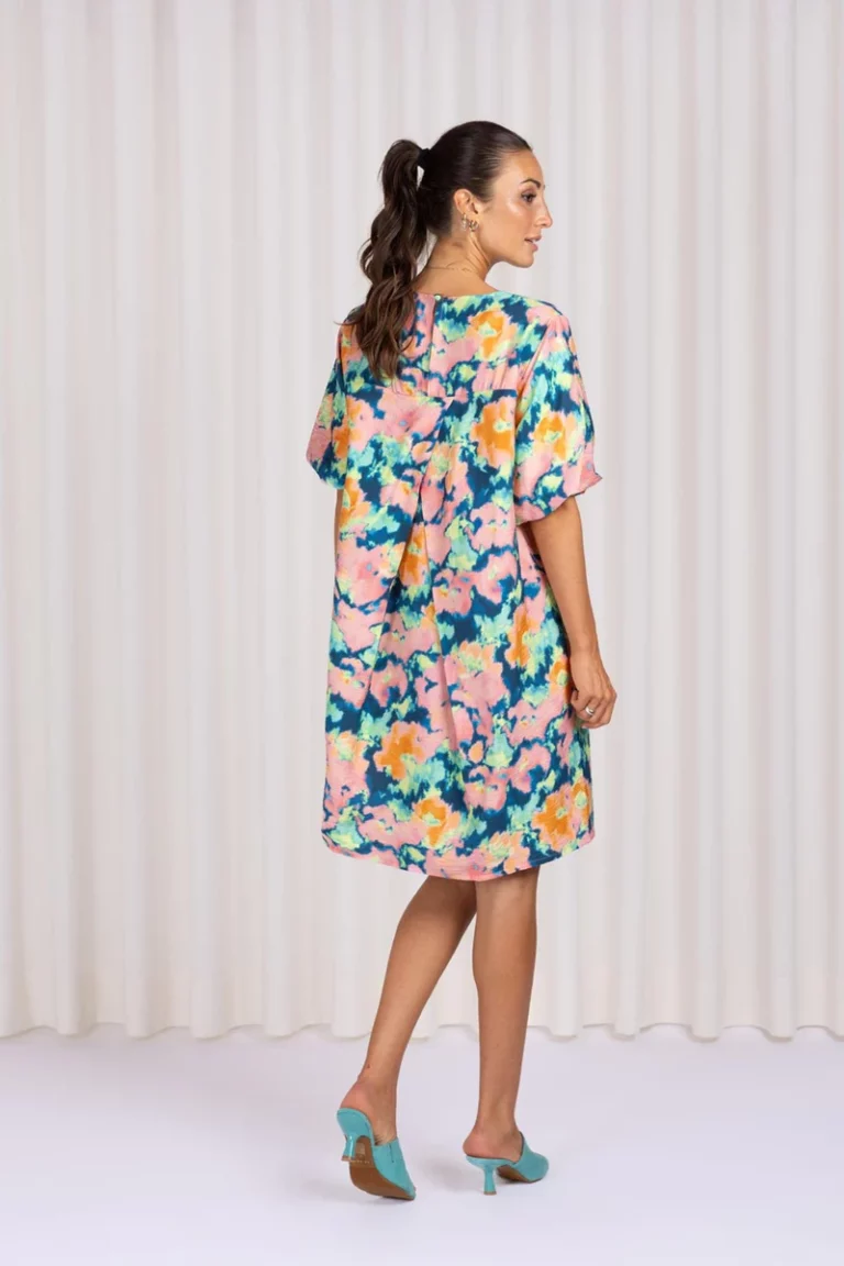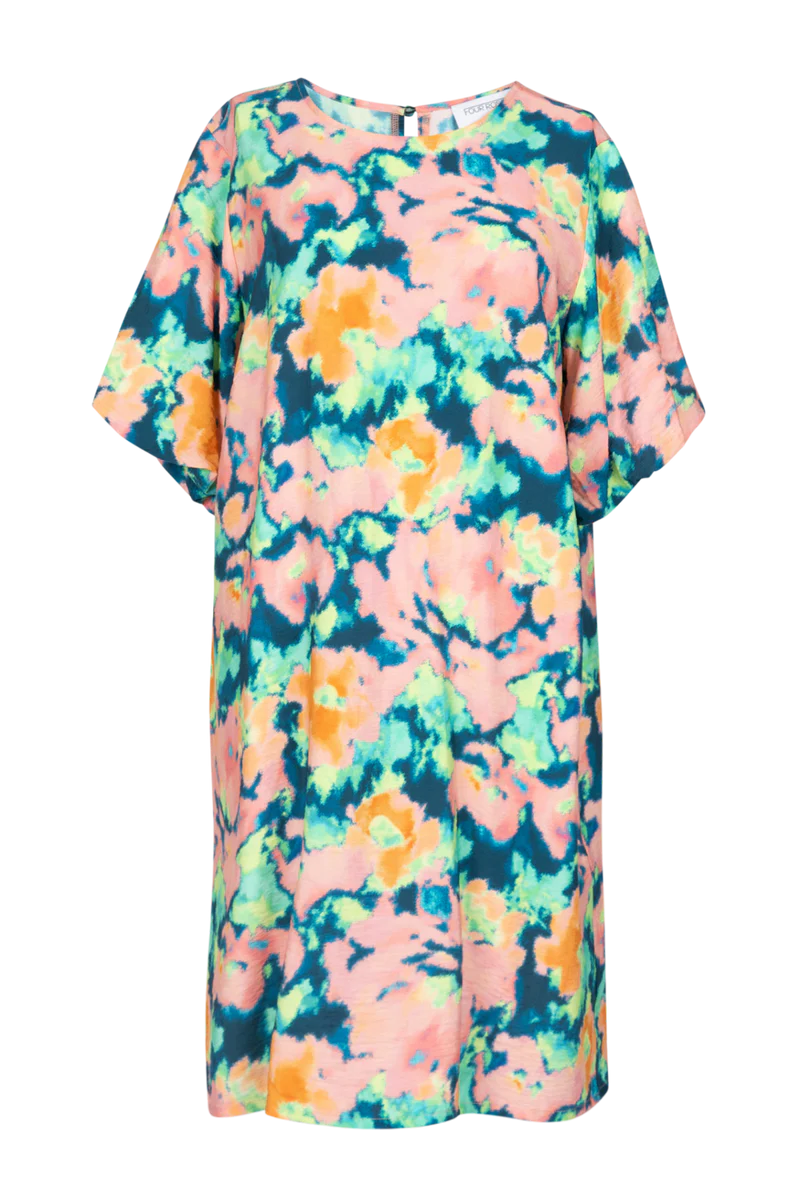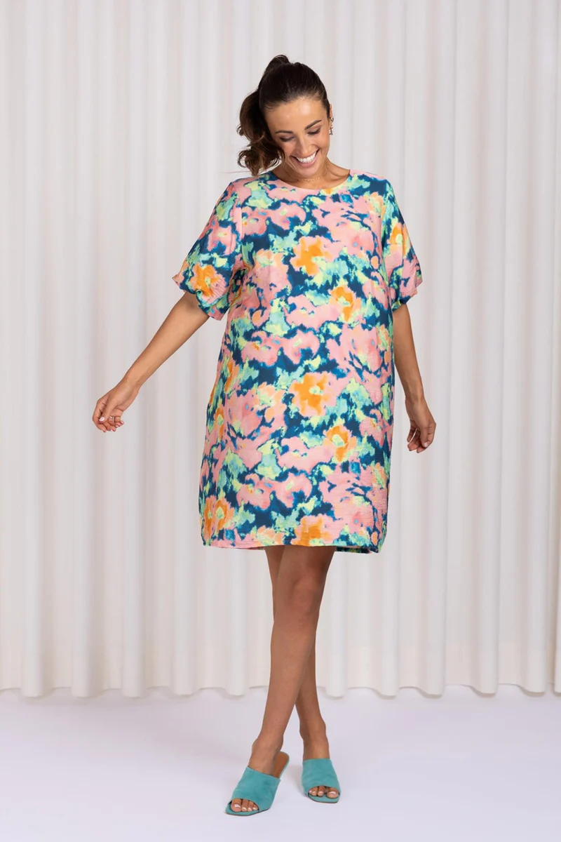 • Deze jurk met kleurrijke abstracte aquarel bloemenprint heeft pofmouwtjes en een ronde hals voor een speelse, vrouwelijke look.