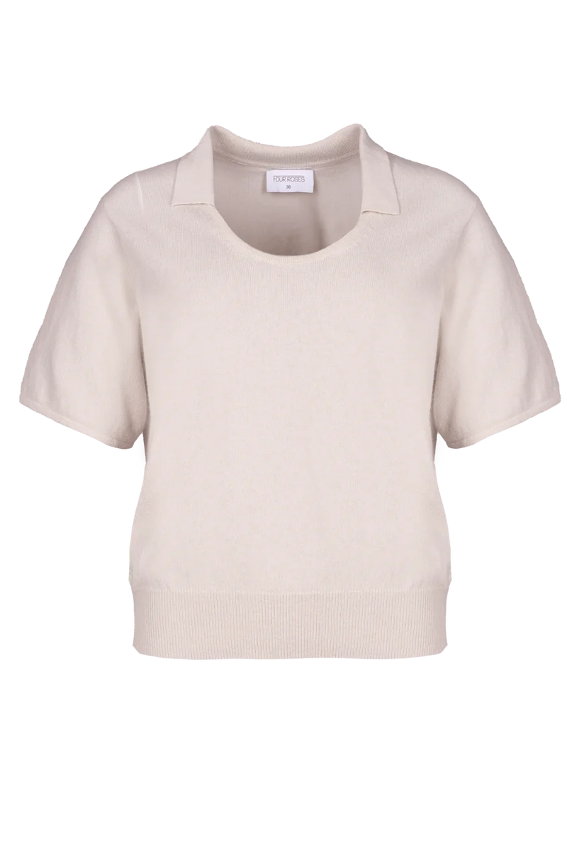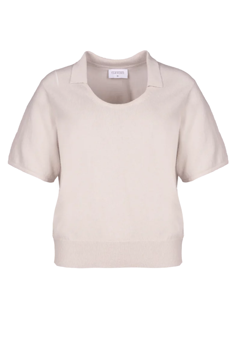• Deze vernieuwde versie speelt het subtiel: een brede ronde hals met ingebouwd colletje en korte mouwen geven een zachte, vrouwelijke twist.