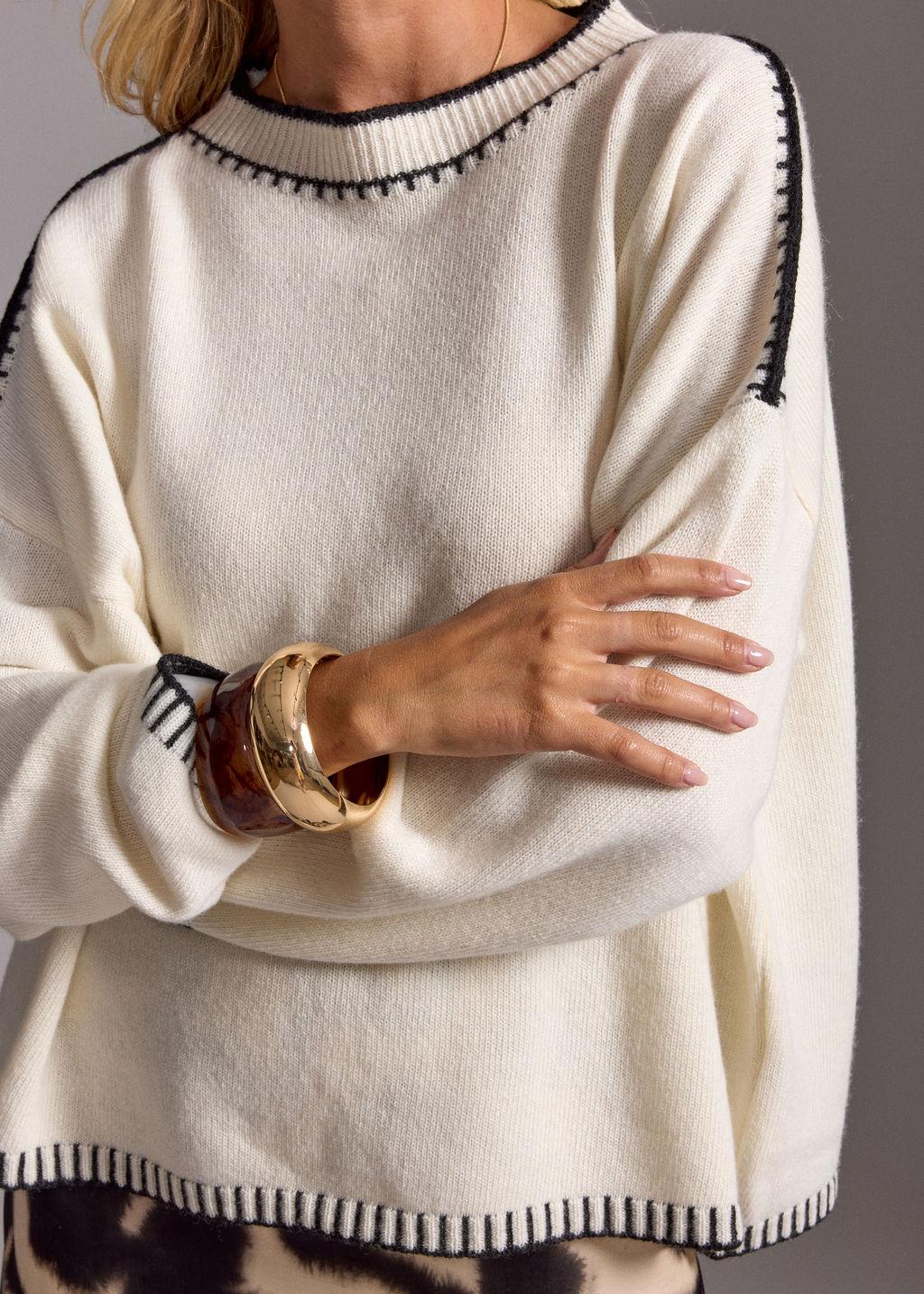 • Ecru met een afwerking van zwarte stiksel op de uiteinden