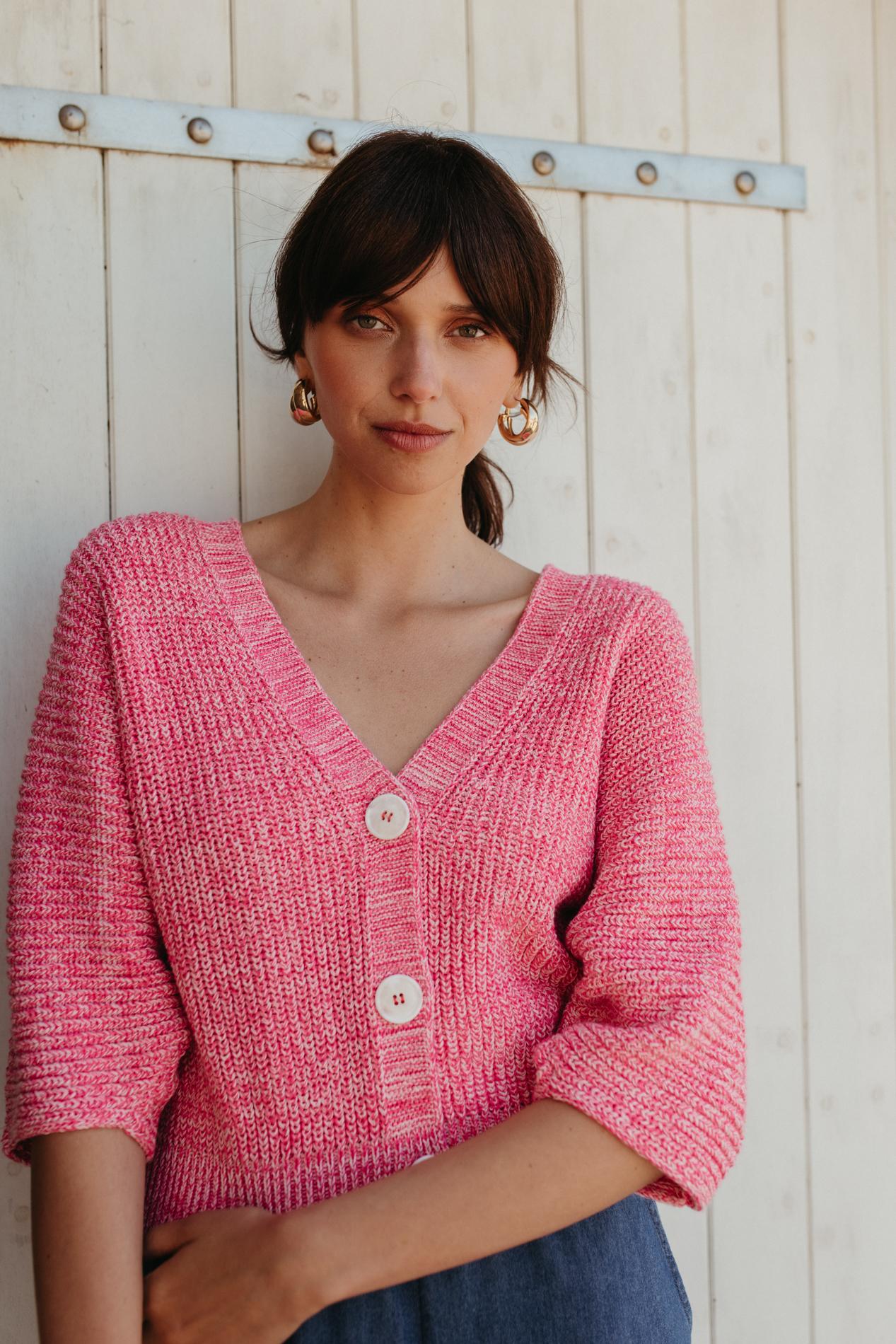 • Vhalssluiting met 3 mooie ronde knopen om ook dicht aan te trekken als pull